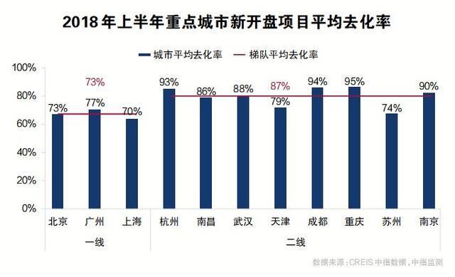 “去化率”是指銷售量與供應(yīng)量的比率,是衡量房地產(chǎn)銷售狀況的一個(gè)重要指數(shù)。2018年上半年,全國14個(gè)重點(diǎn)監(jiān)測城市新開住宅項(xiàng)目當(dāng)天去化率均值為89%。重慶、成都、杭州、南京4個(gè)城市去化率超過平均水平。近九成的去化率,證明目前房屋仍需求緊俏。